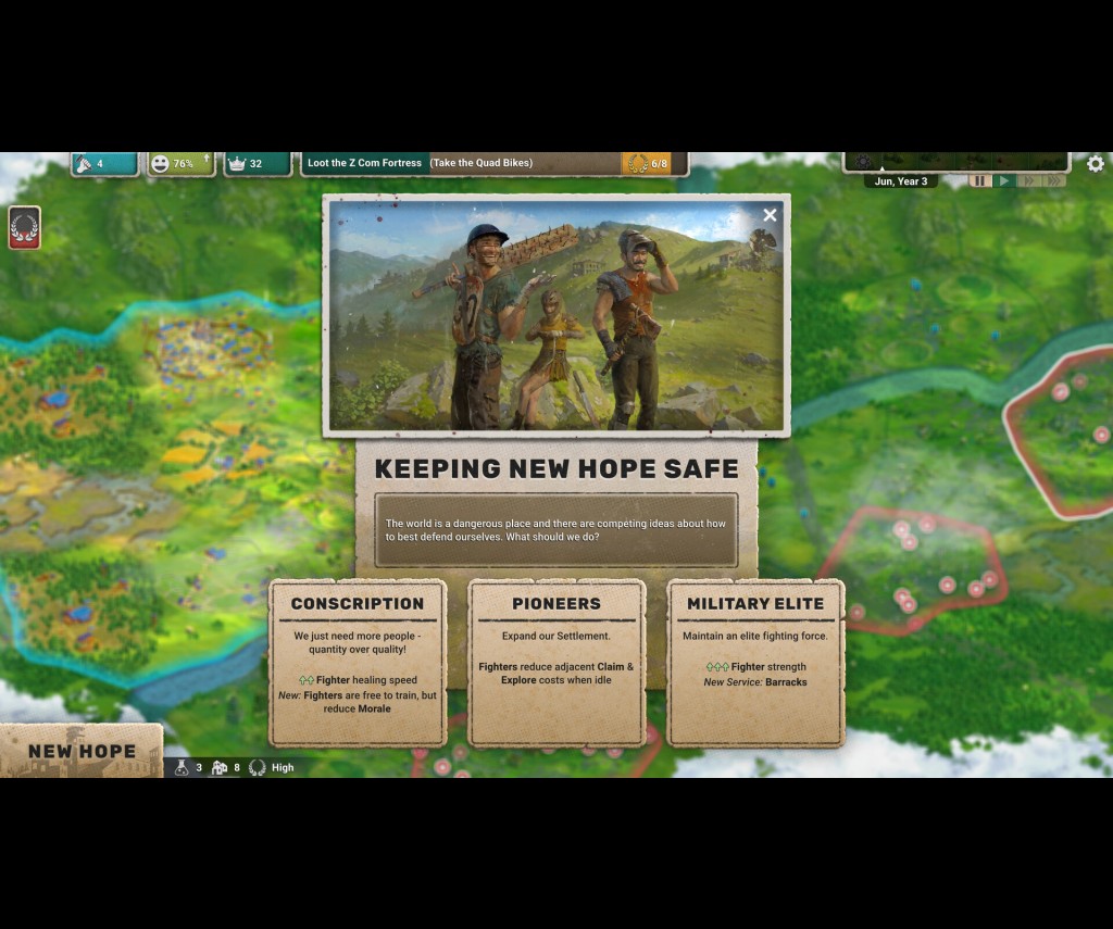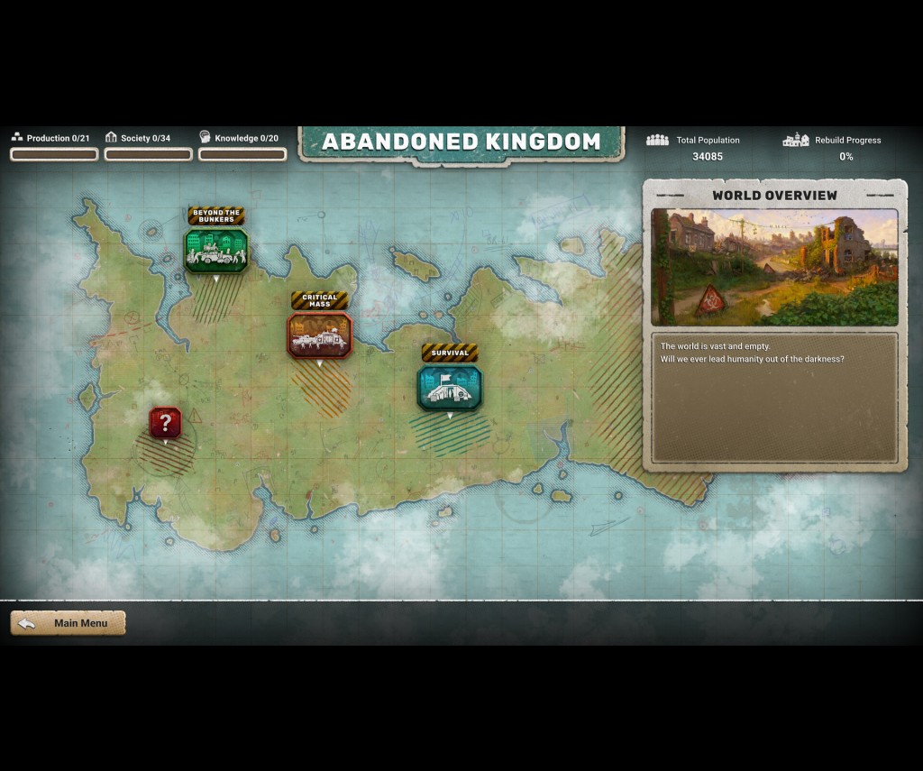 Before advancing your reemergent civilization with new technological developments, or increasing the population size, the player must ensure their resource supply can support said expansion. Staying on top of the supply lines will present one of the biggest ongoing challenges the player will face. Of course there is the occasional surprise attack from zombies to throw just a pinch of chaos into the mix, but one thing that will rush you to a fail state faster than anything is when your people run out of an essential resource, particularly food, water, or firewood.