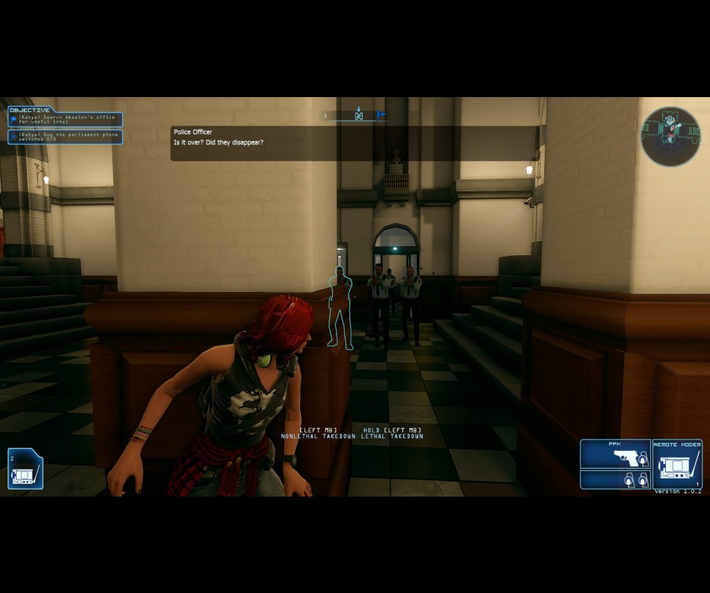 The game seeks to honour the roots of the spy stealth genre by reducing the effectiveness of the action element. That is to say, you'll have a greater chance of success, and accomplish your mission faster if you stay hidden and work together. The hacker will be able to overtake security cameras, look for clues, access email accounts, unlock doors, overload systems, etc., etc., as well as bribe locals to drop supply packages and bribe rent-a-cops to ignore the spy as she passes by. The spy can also pretend to be an employee through dialogue and the hacker can intercept the call from the guard as he double-checks that information, confirming the lie. The spy wears a camera on the chest through which the hacker can monitor progress. Enemies spotted through this and other CCTV cameras will show up on the map and can be tagged by the hacker, allowing the spy to see their location even though walls. These are just some examples as to how this collaboration will work in Clandestine, making for an entirely fresh experience, provided you have someone to play with. If you're going it solo, however, there will be an A.I. hacker with you. How this impacts the enjoyment of gameplay, on the other hand, remains to be seen.