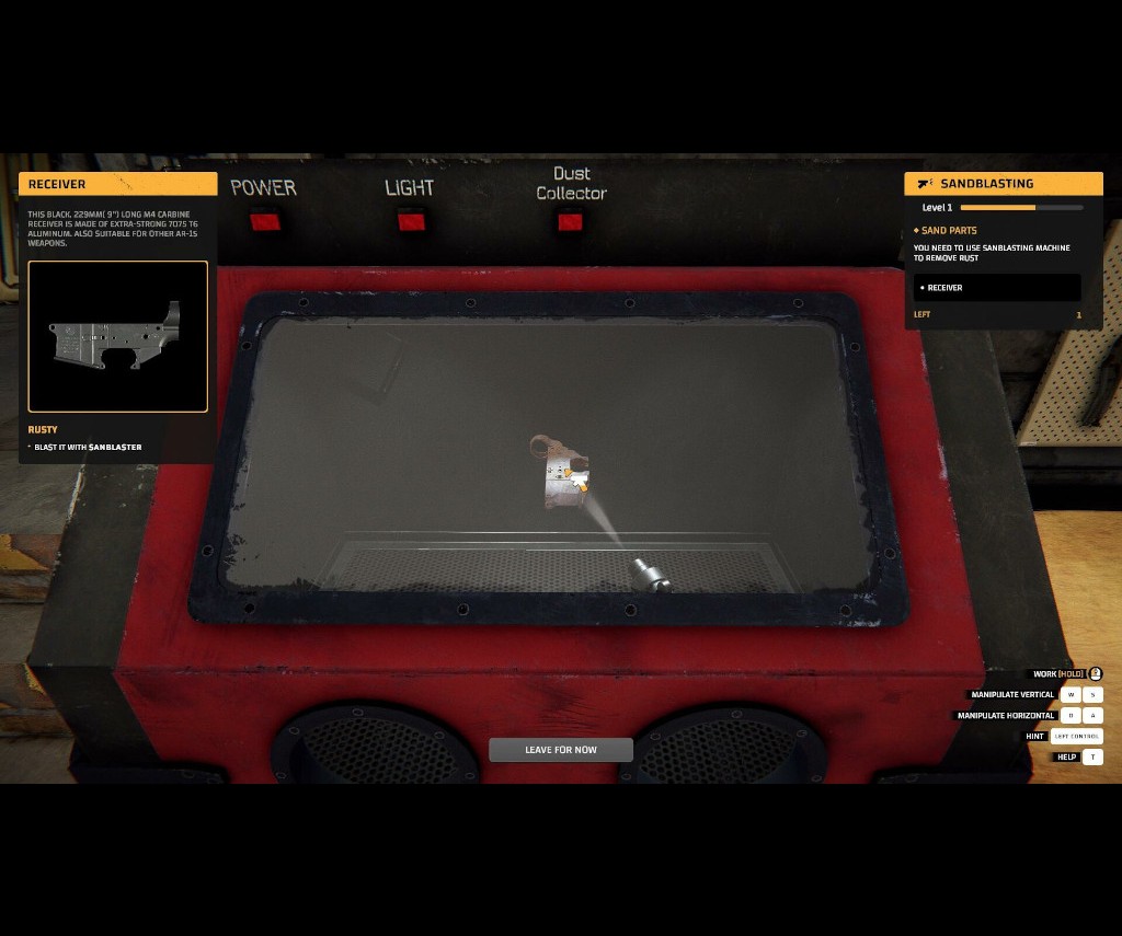 It's not always about how good you are at something it's whether you have the proper equipment to be able to accomplish your task, and this shop has everything. When cleaning parts, producing wooden parts and sand blasting rusty parts, players need to click on the appropriate tool. After further processes are completed the part will be finished and ready to be incorporated in to the assembled gun. These controls are very simplistic in nature and learning the steps is easy as well. The tutorial is incorporated very well in to the game and serves as the basis for how more advanced processes and equipment is unlocked.