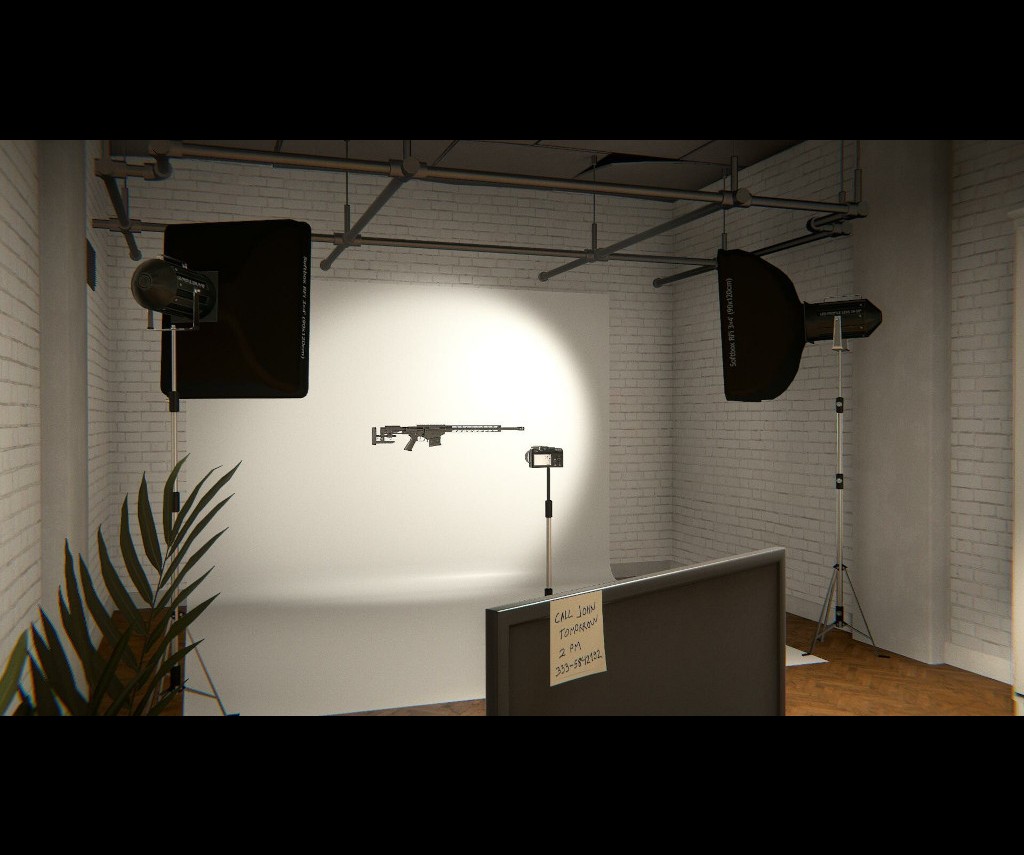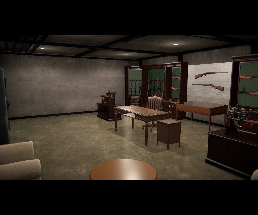 In addition to the assembly work bench there is a packing and unpacking station, a sand blasting station, a wood working and wood painting station, a gun part bluing station, a parts cleaning station, an add-on bench where things such as scopes and silencers are attached, and a gun customization booth where stickers and custom paint can be applied to the finished gun. The use of these is really intuitive and self-explanatory. And of course there's a gun safe where you store your personal firearms and an office that contains a camera set up where pictures of your for sale guns can be taken. Add in the old bunker room behind the sliding bookcase in the office that can be used as a sort of museum where prized guns can be displayed shows the thought that went in to this game.