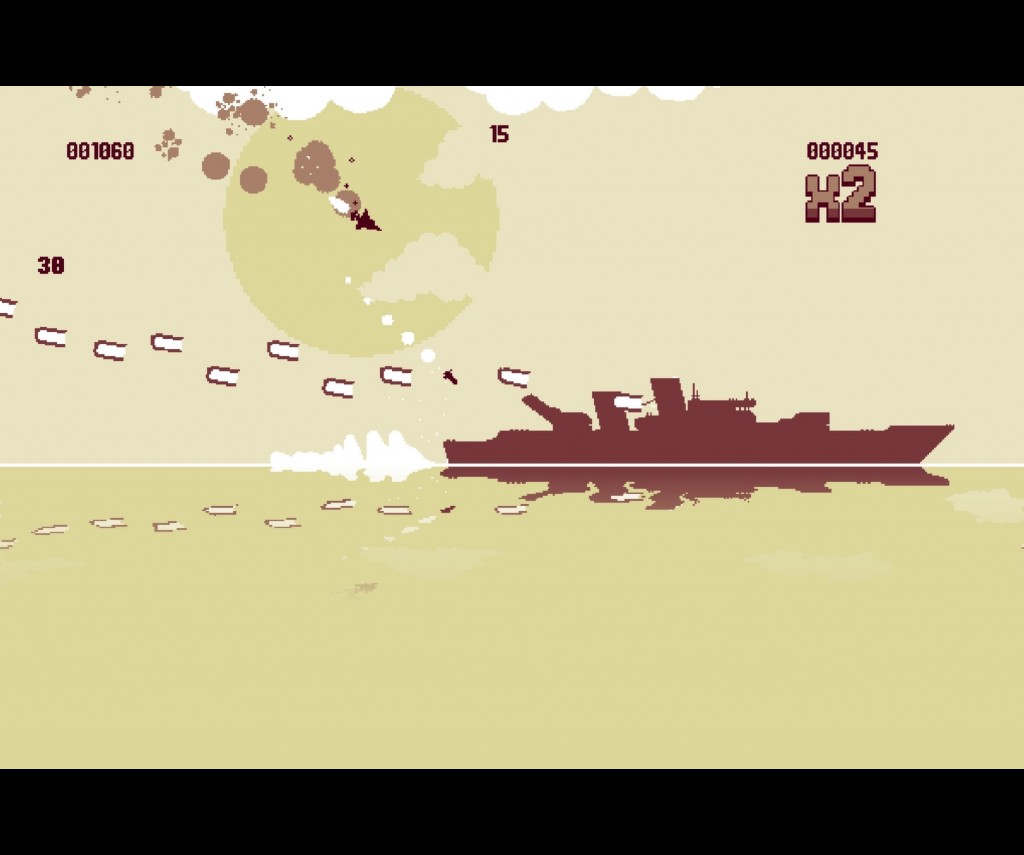 Some planes fly circles around you, generally just getting in the way. Others fire the occasional bullet at you, while some seem content to simply fly straight into you. Some of the most dangerous enemies are battleships, which fire endless volleys at you. Of course, you need to avoid flying into the water, although it won’t be instant death thankfully; it will simply spit you back out and inflict some damage (unless you’re using the waterproof hull). Equally the clouds at the top of the screen will do the same, which is admittedly a little less intuitive than the water, but puts a bound on the playing space. It often feels claustrophobic and incredibly hectic when there’s a lot going on, but when it calms down the skies feel remarkably empty. The enemies are randomly generated, meaning the game is never the same, although sometimes it did feel like there wasn’t enough being thrown at me to keep my combo going. Not a huge problem, but a little frustrating if you are going for that high score.