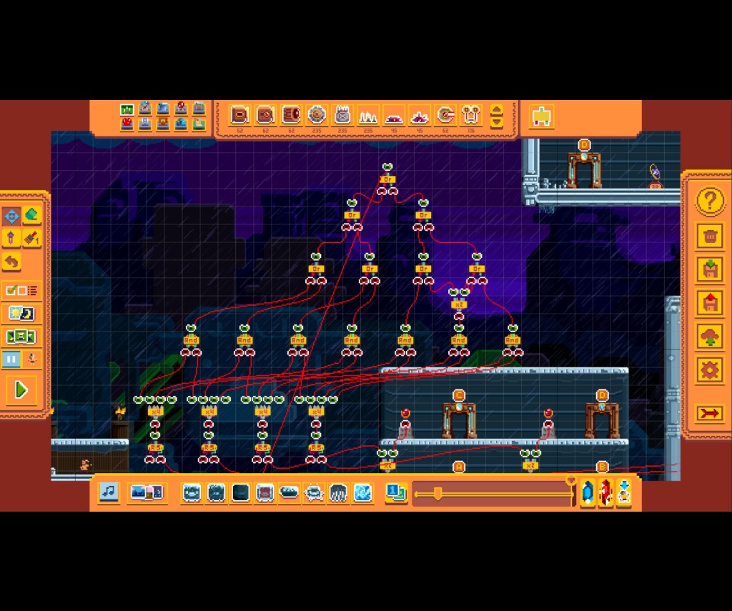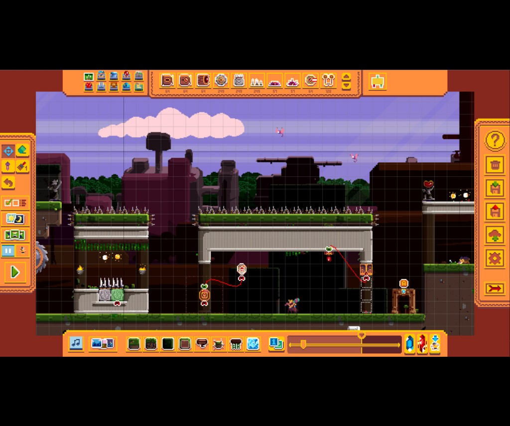 The creation aspect of the game certainly gives a lot of options. On top of an editor that’s pretty intuitive whether you’re using a mouse & keyboard or a controller, there are some pretty extensive options that allow for game logic to be calculated; timers on switches, sequences of events, contextual dialogue triggers - that sort of thing. My concern is that these elements need further foolproofing, as I was quite easily creating edge-case situations that were interfering with the usability of these options. The different backdrops and palette swaps that can be substituted in are varied if a little limited, and there’s a disappointing choice of music to tie to your levels, with only four options to select (six, if you include ‘silence’ and ‘randomly cycling through the other 4’). This is an area that Over the Top Games could quite comfortably expand into, even going so far as seeking community involvement in adding music and art assets.