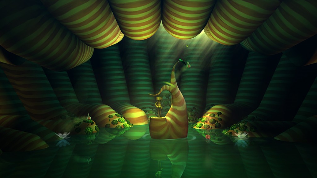 The unknown is an interesting way to start a game. OIO begins by displaying its beautiful hand-drawn environments. This provides a fitting papery aesthetic, since the characters and large parts of the setting are made of wood. The twisting forms and watery bogs shaping the surroundings bear a resemblance to what one would imagine to be the bowels of Wonderland. Inhabiting these vast spaces are plenty of wooden characters, yet none of them show signs of life. A stray beam of sunlight penetrates this subterranean underbelly and causes one of these vacant characters to become animate. Thrust into this world without a clue and amongst such expressionist architecture causes the player to be wary of each step they take. Vulnerability and fear come hand-in-hand.