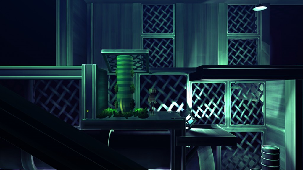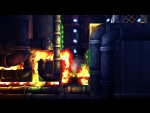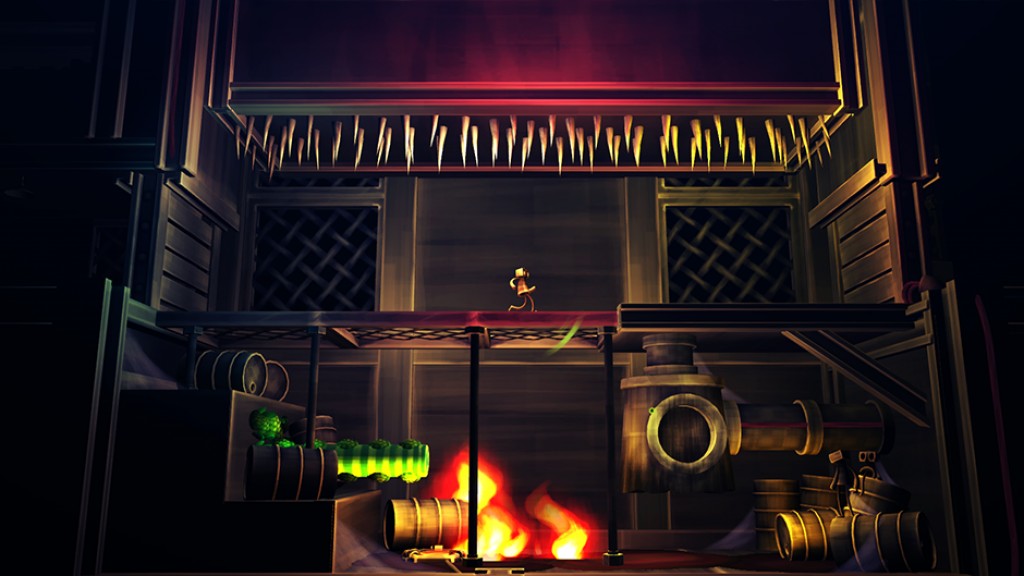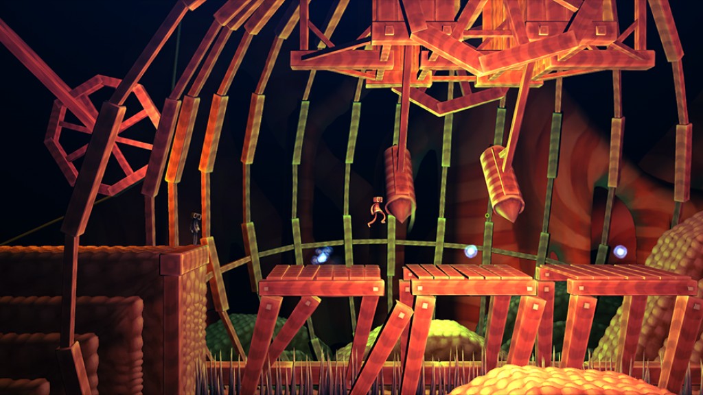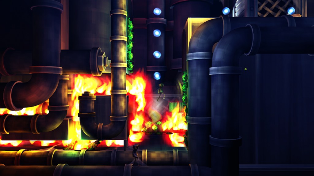 The vacancy and underlying hostility of the game is set at a low boil, but comes to heat in the latter half of the game and is realised as the very real threat of fire and crushing machine parts. The player is gently eased into this culmination throughout the game, but to be honest the game never feels all that challenging until its very end. The platforming is sensible most of the time, but perilous on occasion with the usual spike traps and crumbling platforms. It's well oiled but nothing out of the ordinary, contrary to the game's presentation. The main point of interest concerning the gameplay is the puzzle mechanic; throwing seeds to grow or retract wooden beams on spots of fertility. Each beam has several bumps along it that will give way to another beam if a seed comes into contact with it. Up to three beams can co-exist, with any more meaning that the first dissipates. This limitation means that a misjudged throw could potentially break the whole chain of beams; a dangerous manoeuvre when the branches are acting as a bridge over a fatal drop or a spiky demise. Throwing the seeds can also be used to push out-of-reach buttons, and the beams are used in more imaginative puzzles later on in the game. Nothing will stump (excuse the pun) you for too long though.
