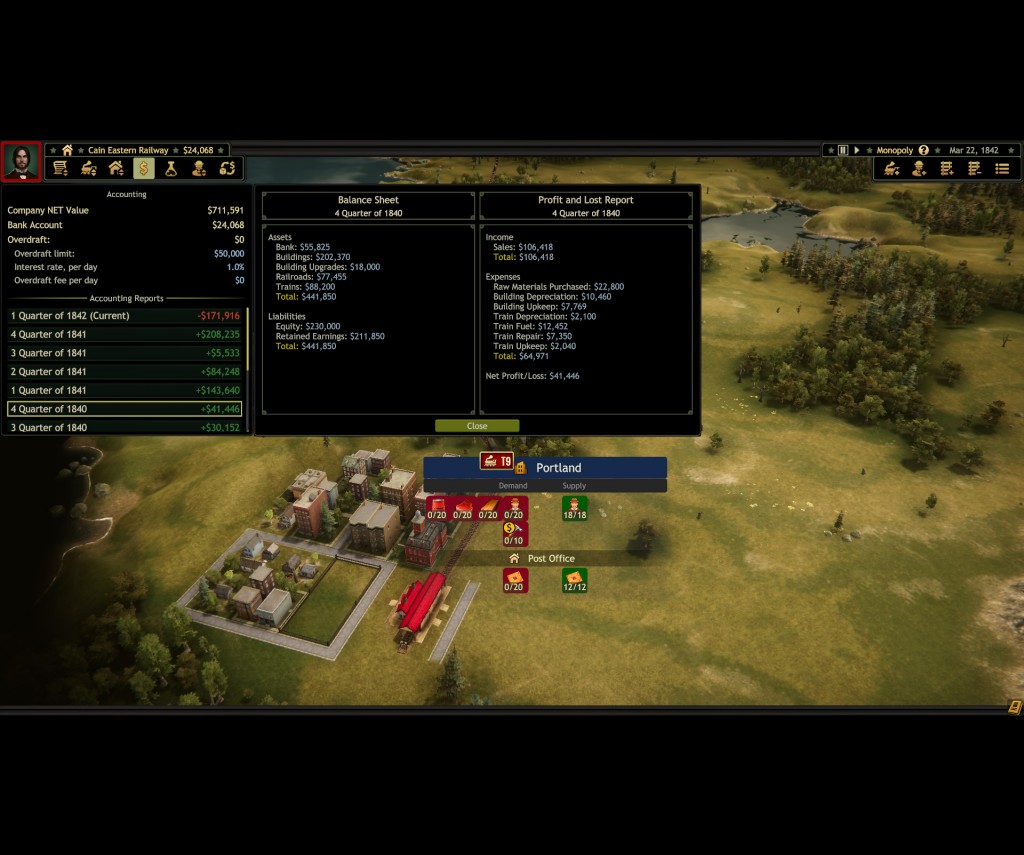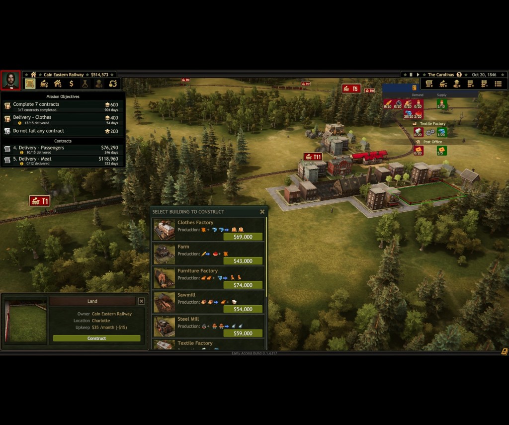 I mentioned setting up factories. That’s as easy as finding a free plot of zoned land, clicking on it and spending money. Factories do not grow, cannot be upgraded, and once you build it, you own it. There’s no going back as it cannot be sold and should you ever end up with an oversupply of whatever the factory makes then you can’t cut your losses. It’s possible the devs do not foresee any losses - the profit/loss reports are very sparse and if a train is operating at a loss there is no way to tell other than to follow it in its tracks and do some manual calculations. But if there are never any losses, what fun will it be to play against the AI that is scheduled to arrive in fall?