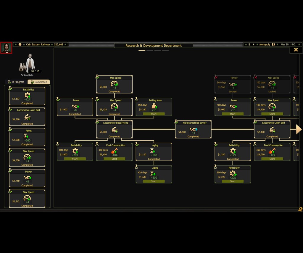 Research is perhaps a bit too simple as well. After building a Research and Development department you’ll gather points to be invested in research. You select what you want to research and wait for the work to be done. That’s it. There’s some branching in the tech tree but it’s not that intricate, new technologies are too incremental and come by so often that you’ll stop paying attention before long. I’m hoping to see some variation here, perhaps branches that are closed off until you reach a specific goal (bigger coal trucks when you’ve hauled x amount of coal... faster engines that become available if you focus on passengers... anything really).