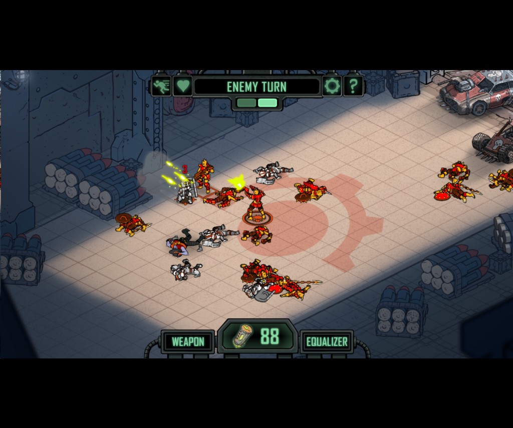 The similarities with Banner Saga, from which the engine was borrowed are, despite the radically different setting, very striking. You’ll get the first hint that the two titles related when you see the style of the artwork, the second are the checkered battlefields. Yet by no means is this a dystopian sci-fi version of Banner Saga. There are way too many twists for that. Unlike most turn-based games, Bedlam doesn’t cycle through the characters on the field. Instead, you and the AI each take a turn, applying two actions to whichever character you choose.