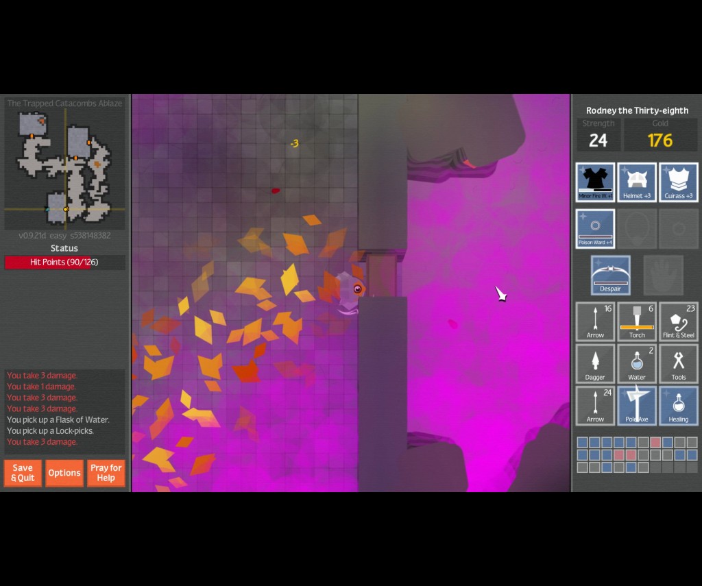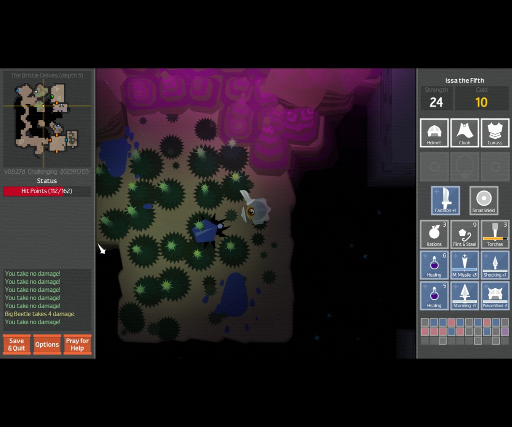 Contrary to the wisdom of teachers or athletic trainers, in this adventure your avatar won’t get any better with practice and experience. There’s certainly merit and just cause for roguelikes that implement some sort of carryover XP or stat system to encourage you to keep playing and help you progress, but there’s also something empowering about games that don’t, like Unexplored, in which you’ve got everything you need to succeed from life one. Even individual runs don’t rely on level-ups, instead basing all of your power and potential on the items you pick up or the books you read. Sure, this makes success even more dependent on the RNG, but it also lets you focus on exploring and surviving instead of seeking out fights for XP.