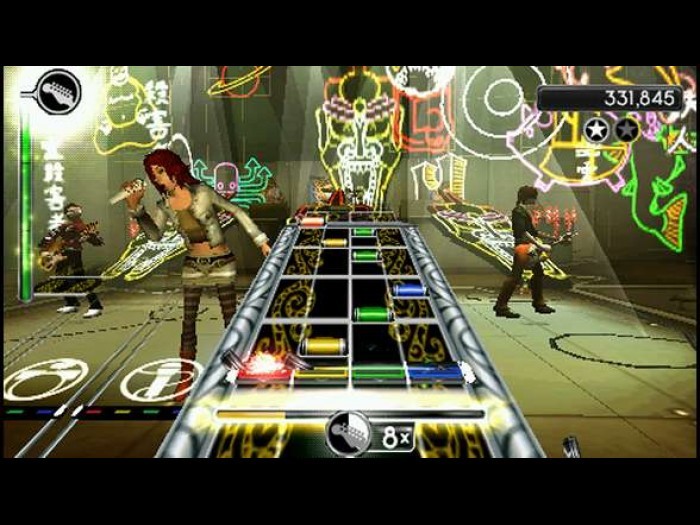 When you're actually playing the game you use the left D-pad (red), up D-pad (yellow), triangle (green) and circle (blue) (DJ Max Portable vets will already have this down pat). As you can see there is no orange present since the game only uses four buttons, but don't let this misguide you into thinking the game is easy because it is far from that. To make the game a tad easier on recognizing what buttons to hit together, the orange bar that was used for the kick pedal on the drums now ties notes that are apart from each other. This helps identify when to hit two notes simultaneously and thus makes it a bit easier when all these little notes are whizzing by. Overdrive (or Star Power) is still the same, and can be activated with the X button, but having to perfectly play every phrase can make gaining Overdrive a little hard.
