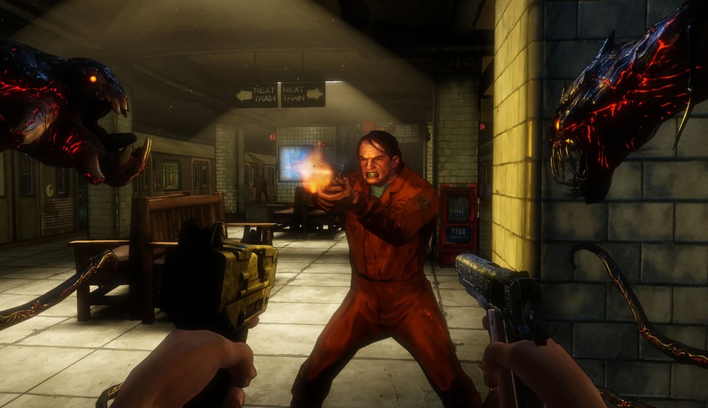 The recently-released demo for the The Darkness II allows players to try out the tutorial and introduction of the upcoming game. The demo starts with Jackie basically being crucified by some guy (possibly the leader of The Brotherhood), and his thug while some artefact is draining The Darkness out of Jackie. Pretty much all of the demo’s gameplay is comprised of flashbacks, with jumps back to the present to relate more of the story. The flashbacks will allow you to take Jackie through a shoot-out in a restaurant, battle through the streets of New York and then down through a subway station.